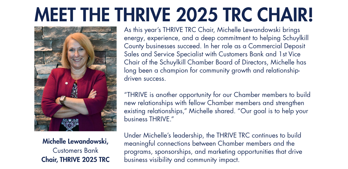 The Schuylkill Chamber of Commerce has officially launched THRIVE (tools, help, resources, innovation, value, engagement) Schuylkill - Total Resource Campaign, a bold new initiative designed to transform how businesses engage with the Chamber and how the Chamber drives business growth across the region.